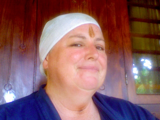 2 o’clock torture time soon came round. I dragged myself up the hill to Beena and Binjhu who greeted me warmly. Beena: “Have you been to the toilet?” “How many times?” “Vomiting?” When I said no, I had not vomited, Beena sniffed. That was the wrong answer. When I told her about the ginger tea she shook her head, not from side to side Indian yes fashion, but western style, eyes heavenward “you stupid woman” fashion. Beena and Bindhu were kind to me today and did not thump me with anything at all. A facepack. Something cold on my eyelids. I was starting to feel pampered. “Sit” she ordered. And then they brought out a big brass bowl of mud like sludge. It smelt like the stuff I drank this morning. They plastered it on my head. Then the banana leaf was applied. “One hour keeping” instructed Beena. As I left, Bindhu put a teatowel round my neck as if it were a jasmine garland. Back at my terrace, reading my book, I soon realised that brown liquid was running down my face and neck as the sludge was melting in the heat. That was what the teatowel was for. 4 washes it took to get that sludge out of my hair. So at least my hair is cleansed.